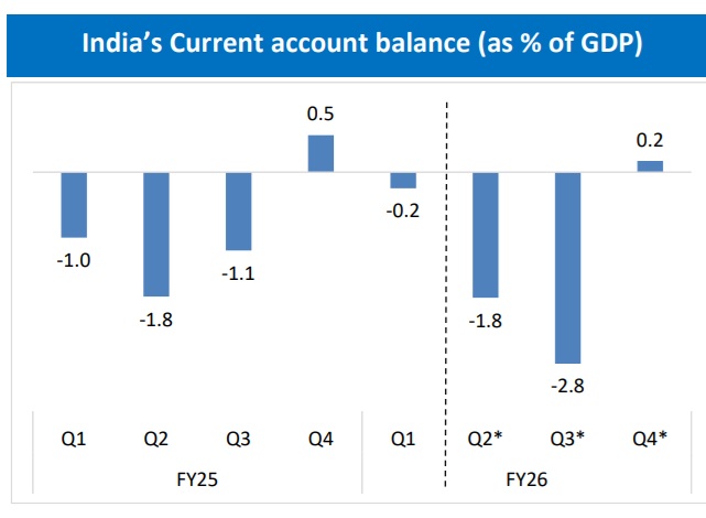 On a BoP basis, India’s current account deficit (CAD) placed at 0.2% of GDP in Q1 FY26, as against 0.9% in Q1 FY25. This improvement in CAD was mainly owing to robust services exports and strong inflow of remittances. Based on the above trends, we expect India’s current account will be in deficit mode of 1.8%/2.8% of GDP in Q2/Q3 FY26 before it will turn into positive side in Q4 FY26. For the complete fiscal (FY26), we expect an overall deficit in the range of ~1.0-1.3% of GDP. Regarding overall BoP, we expect a marginal deficit of upto $10 billion for FY26 as compared to $5.0 billion in FY25. Thus, even though BOP will turn negative in FY26, the alarm bells that are being sounded regarding its impact on rupee movements seems to be a little overblown at this point. In fact, at an aggregate basis, India’s merchandise trade balance of goods and services has increased very modestly during Apr-Oct, even after the tariff meltdown.