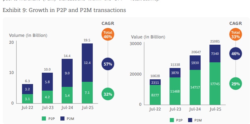 A key driver of this digital surge has been the rise in peer-to-merchant (P2M) transactions within the UPI ecosystem. As seen in Exhibit, over the past three years, P2M payments have grown at a faster pace than peer-to peer (P2P) transactions. This momentum is fuelled by the increasing formalization of the market, with more small merchants embracing digital payment solutions. This is also reflected in the increased share of online UPI transactions, which stood at 77%31 as of August 2025, indicating a preference among users for paying online. As a result, merchant transactions now lead in both volume and value growth, underscoring the expanding role of digital payments in everyday retail activity.