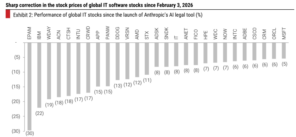 Domestic IT services and global IT product prices have seen a steep correction in their stock prices (see Exhibits 1-2) on concerns about AI models reducing the relevance of (1) coders and (2) enterprise software. The jury may be out on the implications of the fast-paced developments in the AI industry for several sectors. However, the investment industry must take cognizance of ‘disruption’ threats and price in the risks to the best extent it can through a higher cost of equity or lower multiples. The bulk of the investment community has been loath to price in even ‘known’ risks. As recent events have shown, the ‘unknown’ risks (geopolitical, policy, technological) have increased dramatically.