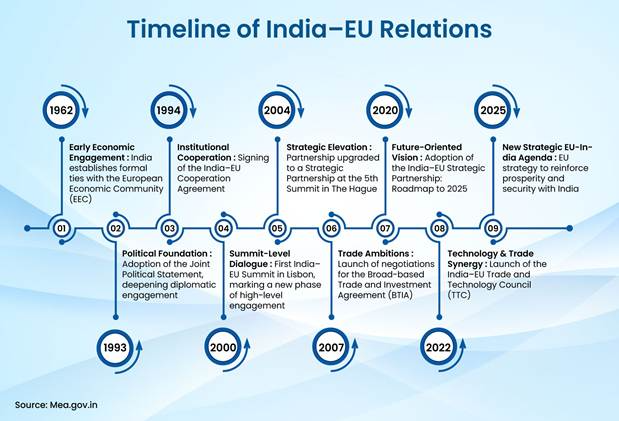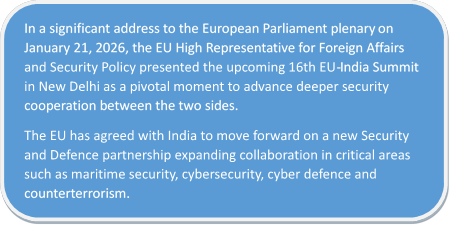India–EU relations have entered a phase of renewed strategic momentum, with both sides intensifying engagement ahead of the forthcoming India–EU Summit in New Delhi. India and the European Union are seeking to advance long-pending Free Trade Agreement (FTA) negotiations and adopt a new Joint Strategic Agenda to steer the partnership beyond the existing roadmap. This ongoing engagement underscores a mutual commitment across trade, investment, clean and green energy, science and technology, security and defence, digital initiatives, connectivity, space, and agriculture.