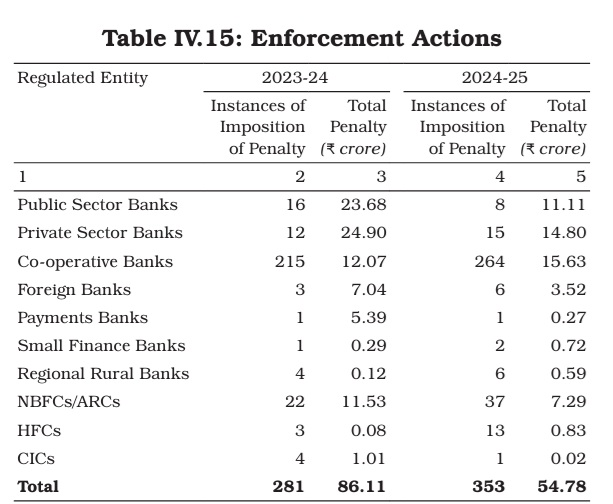 Enforcement actions endeavor to ensure regulatory compliance, achieve credible deterrence and maintain stability and integrity of the financial system. During 2024-25, instances of penalty imposed by the Reserve Bank increased across all regulated entities, except PSBs, PBs and CICs.