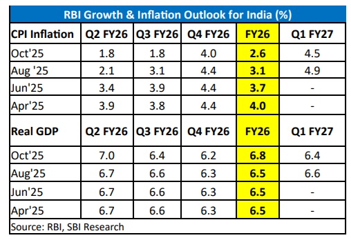 ¨ RBI has revised upwards its projection for real GDP growth for FY26 by 30 bps to 6.8% owing to buoyancy in services sector coupled with steady employment conditions, rising capacity utilisation, conducive financial conditions and boost from the streamlining of GST. However, ongoing tariff and trade policy uncertainties will impact external demand for goods and services. Prolonged geopolitical tensions and volatility in international financial markets caused by risk-off sentiments of investors also pose downside risks to the growth outlook.