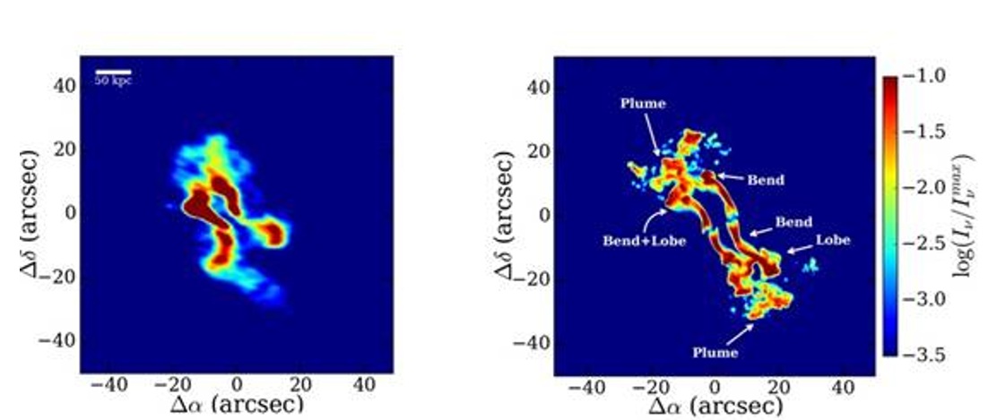 Their study published in the Astrophysical Journal proved the crucial role played by the slow swiveling (like a spinning top wobbling as it slows down) or precession of the twin plasma jets emanating from the two supermassive black holes in this system to form the observed structures.