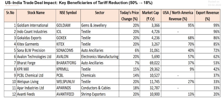 Jahol Prajapati, Research Analyst, SAMCO Securities, explains: "The US–India trade deal, which reduces import tariffs from 50% to 18%, is expected to materially benefit export-oriented sectors with high exposure to the US market. Textiles & Apparel, Gems & Jewellery, Electronics manufacturing, Auto Ancillaries, and Chemical exporters emerge as the key beneficiaries, given their significant revenue contribution from the US/North America. The table highlights Indian listed companies from these sectors that stand to gain the most from improved price competitiveness and potential volume expansion following the tariff reduction."