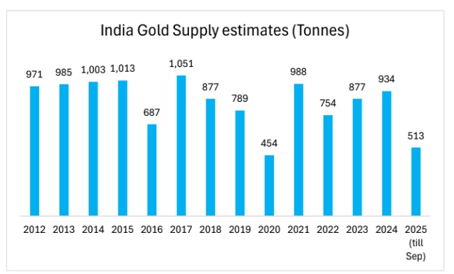 ❑ Domestic supply of gold is only a fraction of the total supply of Gold in India, with imports contributing around 86% of the total supply in 2024 (World Gold Council estimate)