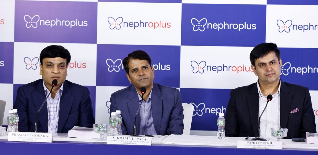 (L to R) Prashant Goenka, Chief Financial Officer, NephroPlus; Vikram Vuppala, Founder, Chairman and Managing Director, NephroPlus; and Rohit Singh, Group Chief Executive Officer, NephroPlus at a press conference held on Thursday for the company’s forthcoming IPO