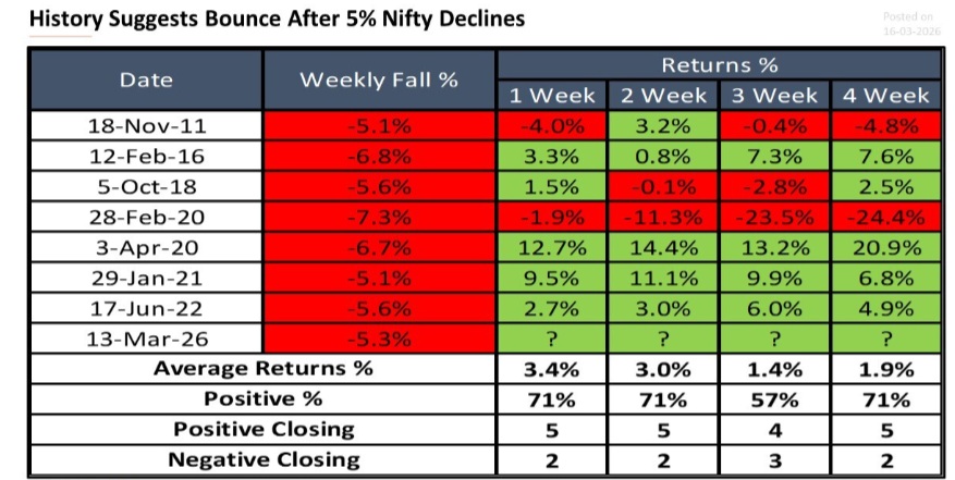 The latest instance on 13 March 2026, when the Nifty fell 5.3% for the week, places the market