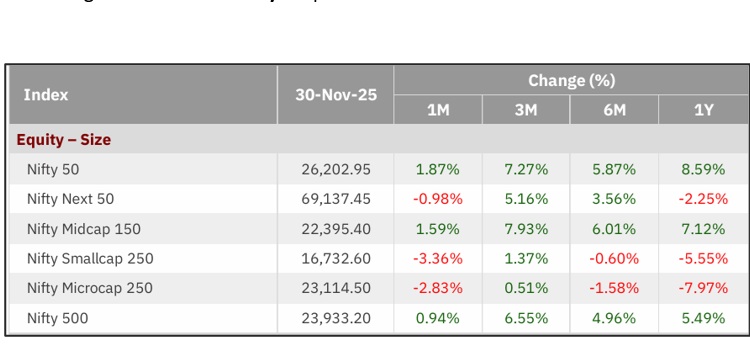 The broader market also delivered healthy gains, with the Nifty 500 gaining 0.94% in November 2025, with large and midcap up about 1-2% and smallcaps corrected by around 1-3%. Over the last 3 months, 6 months, and 1 year the index has consecutively given positive returns of 6.55%, 4.96% and 5.94%.