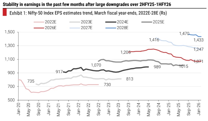 We expect FY2027E and FY2028E net profits of the Nifty-50 Index to grow 16% and 15% after a muted 8% growth in FY2026. We base our constructive view on earnings on (1) higher nominal GDP growth in FY2027 (around 10%) versus in FY2026 (around 8%); (2) recovery in consumption demand from 2HFY26, aided by lower GST, income tax and interest rates; and (3) stronger export revenues on the ‘conclusion’ of the long-pending India-US trade deal. Nonetheless, we note downside risks to earnings from (1) weaker-than-expected global growth and (2) lower-than-expected margins in the case of automobiles and consumer staples on raw material and/or competitive pressures.