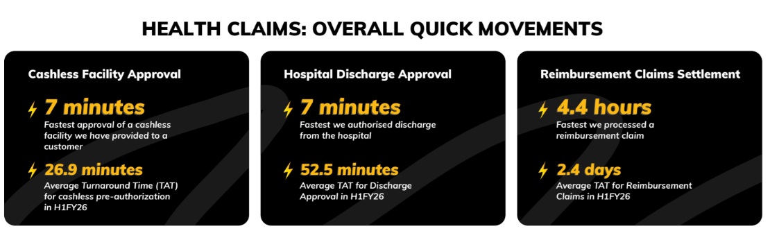 · Cashless Pre-Authorization: In H1FY26, our average turnaround time stood at 26.9 minutes, with the fastest approval delivered in just 7 minutes. (IRDAI TAT requirement*: 1 hour)