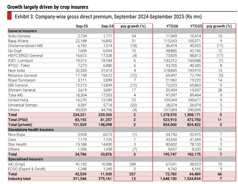 The overall GWP growth (ex-crop) for the industry was moderate at 11% yoy, in line with the 10% yoy growth reported for YTDFY2026. Growth in key retail segments such as motor and retail health was lower at 7-8%. Strong growth in commercial lines has supported overall premium growth for the industry. Fire premiums were up 32% yoy in September 2025 and 21% in YTDFY2026, likely driven by a better pricing environment. PSUs remain aggressive in the fire segment, gaining 620 bps market share yoy to 42%. It was a strong month for the crop business, up 23% yoy.