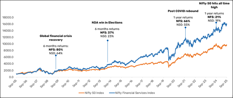 The study also highlights that the BFSI sector has consistently outperformed the broader market over the past two decades, as reflected in the Nifty Financial Services (NFS) Index versus the Nifty 50. Just after the global financial crisis recovery in 2009, NFS surged 80% in just six months compared to Nifty 50’s 64%. Similarly, following the election results in 2014, NFS delivered 37% returns in six months versus 23% for Nifty 50. The post-COVID rebound in 2021 further highlighted this strength, with NFS gaining 66% in one year against Nifty 50’s 55%. Even at the market peak in 2024, NFS managed to edge out broader market returns, rising 21% versus 19%. This consistent outperformance underscores BFSI’s position as a key driver of India’s capital markets, supported by rising financialization, strong fundamentals, and expanding retail participation aligning with the characteristics of a megatrend.