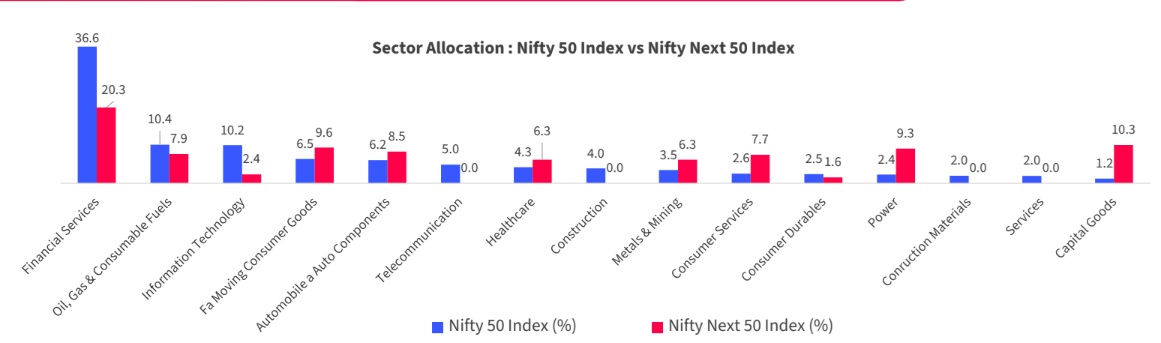The Nifty Next 50 Index represents 50 companies from Nifty 100 after excluding the Nifty 50 companies. This selection aims to give investors exposure to potentially growing names with the reliability of large caps. The ETF currently is well-diversified across sectors, reducing concentration risk while providing unbiased exposure.
