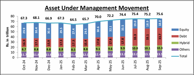According to Study, For the Sept’25 quarter, equity schemes saw an inflow of Rs. 1,06,554 crores as compared to an inflow of Rs. 66,869 crores in the previous quarter. Debt schemes saw an outflow of Rs. 3,156 crores in the Sept’25 quarter vis-à-vis an inflow of Rs. 2,01,516 crores in the previous quarter. Once again, Hybrid schemes saw an inflow of ~Rs. 45,570 crores in the Sept’25 quarter, after an inflow of ~Rs. 58,235 crores in the previous quarter. Monthly SIP numbers touched an all-time high of Rs. 29,361 crores by the end of Sept’25 as compared to Rs27,269 crores in the month of June’25.