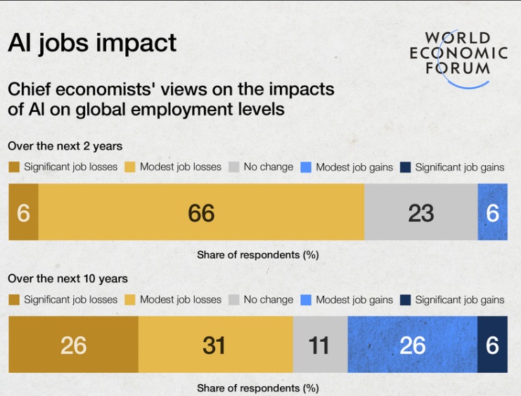 The employment picture in relation to AI is expected to evolve over time: two thirds expect modest job losses over the next two years, but views diverge sharply over the longer term: 57% anticipate net losses over 10 years, while 32% foresee gains as new occupations emerge.