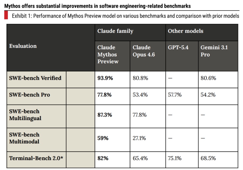 Anthropic’s Mythos model exhibits a step-jump in benchmark performance across software engineering tasks, a deviation from the trajectory of incremental/moderate improvements in the recent past. Mythos provides a large improvement in agentic software development, based on qualitative assessments. We believe that the model raises near- to medium-term disruption risks for IT services with the caveat that model capabilities are largely unproven in real-world scenarios due to a lack of a public release. Risks can be higher for firms with more exposure to application services.