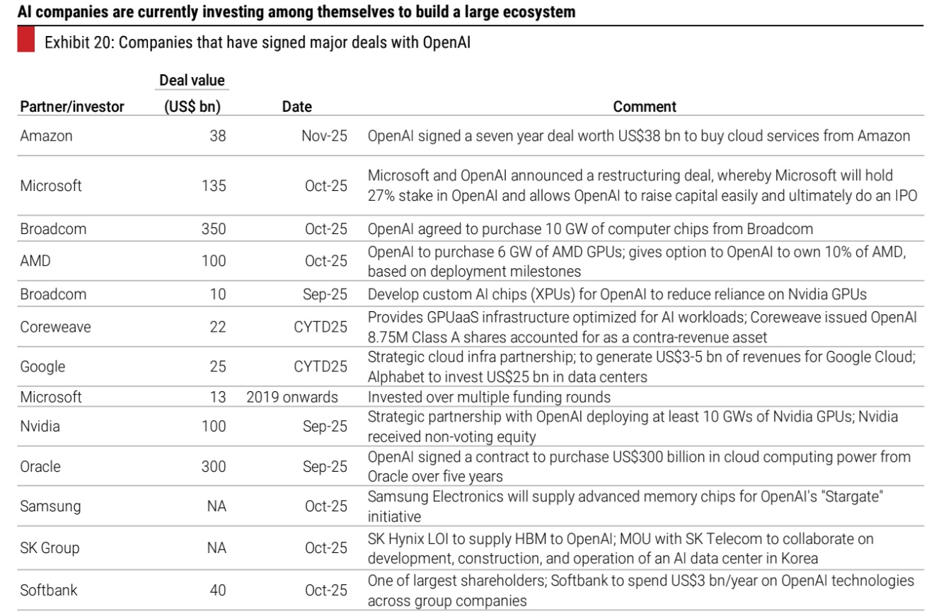 A simple back-of-the-envelope calculation of OpenAI, which is central to the AI theme, with its US$1-1.5 tn of committed investments, shows the mind-boggling implied revenue and profit pools of AI players. A 10% CRoCI on US$1-1.5 tn of investment would imply US$100-150 bn of cash return (annually). OpenAI could achieve US$200-250 bn of annual revenues if 800 mn-1 bn users were to pay US$20 per month fees. At present, OpenAI has around 40 mn paying subscribers out of its 800 mn subscribers. It expects to reach US$100 bn of revenues by 2027. We would note that there are several such competing AI services; the world has around 8 bn people and many may not require or may not be able to pay the US$20 monthly fee for any AI service.