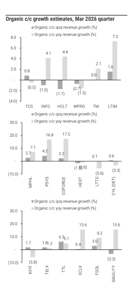 4 | Infosys. We forecast revenue decline of 1% qoq primarily due to lower billing days and seasonal weakness. We expect stable revenues from sale of third-party items. We expect stable margins as benefits of rupee depreciation is offset by higher visa costs. Sharp decline in other income after completion of buyback to result in moderate net profit growth. We expect large deal TCV of US$2.5-2.75 bn, stable on yoy comparison. We believe Infosys will guide for 3-5% growth in revenues including Versent acquisition and 2.25-4.25% on organic basis. Hurdle rate to achieve the revenue growth guidance stands at CQGR of 1.2-1.9% (0.8-1.6% CQGR on organic basis). We expect investor focus on: (1) impact of Iran war and GenAI deflation on growth prospects, (2) change in decision-making pace of clients due to rapid improvement in agentic capabilities, (3) willingness to take up large transformation programs that are margin dilutive initially, (4) percentage of programs that have moved from PoC to production, and (5) incremental benefits that can accrue from Project Maximus. |
