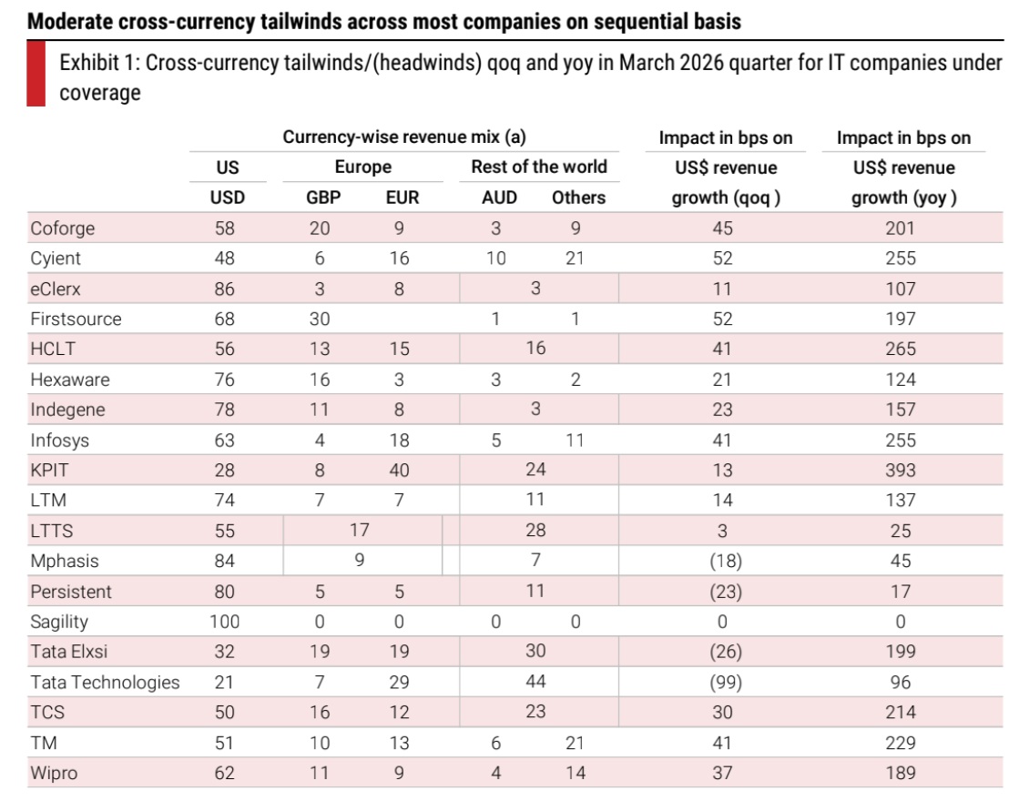 4QFY26 performance is likely to remain muted, but with a stable to improving yoy growth trajectory. A sharp depreciation of INR against USD means many companies will report double-digit yoy earnings growth. FY2027 guidance will be shaped by geopolitical uncertainty from the Iran war and increasing revenue deflation from GenAI-led programs. We expect Infosys to guide to 3-5% revenue growth for FY2027 with stable margins, while HCLT is likely to guide to 3-5% overall growth with a modest 50 bps expansion in its EBIT margin band. Tech Mahindra, TCS, Infosys and Coforge are our key picks.