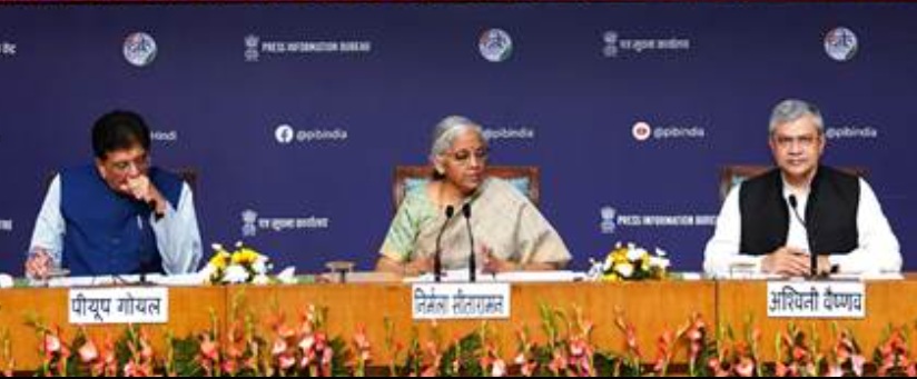 Mumbai, October 18, 2025: Union Minister for Finance and Corporate Affairs Smt. Nirmala Sitharaman; Union Minister for Commerce and Industry Shri Piyush Goyal; and Union Minister for Minister for Railways, Information & Broadcasting, Electronics & Information Technology Shri Ashwini Vaishnaw held a joint press conference on GST Bachat Utsav in New Delhi, today.