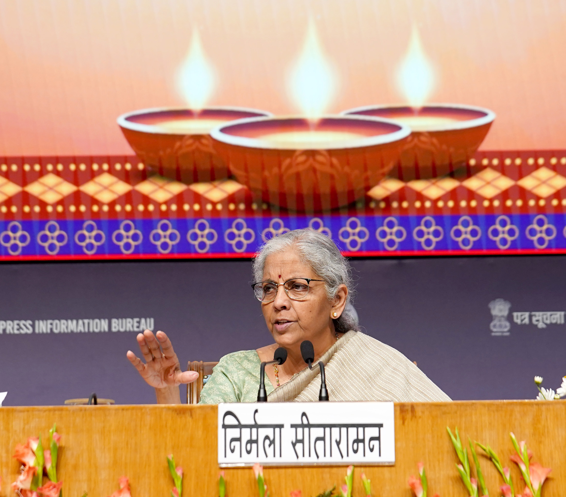 The Union Minister for Finance and Corporate Affairs, Smt. Nirmala Sitharaman addressing a Press Conference on GST Bachat Utsav at National Media Centre, in New Delhi on October 18, 2025.