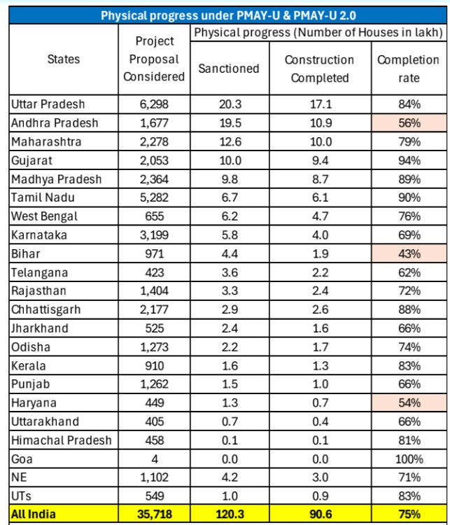 ❑ Progress so far: 1.2 crore houses were sanctioned so far (till 25 Aug) under PMAY-U and PMAY-U 2.0...Of all the houses sanctioned, the construction of 75% houses completed. While most of the states have progress rate of 75% or more, there are some states where progress is less than 60% (like Andhra Pradesh, Bihar and Haryana)