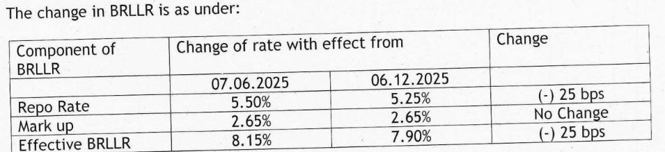 Following the Reserve Bank of India reducing the policy repo rate, Bank of Baroda (Bank), one of India’s leading public sector banks, has reduced its Baroda Repo Linked Lending Rate (BRLLR) by 25 basis points effective 06.12.2025. The Bank’s BRLLR now stands at 7.90%.
