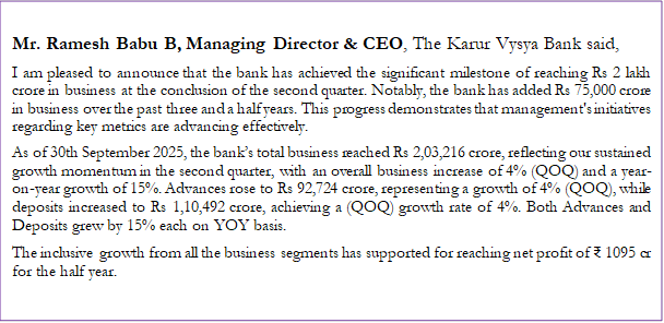 Mumbai, October 18, 2025: Karur Vysya Bank (‘the Bank’) announced its financial results for the Quarter/half year ended September 30, 2025 on Friday. The Bank continues its healthy performance in terms of business growth, profitability as well as asset quality.