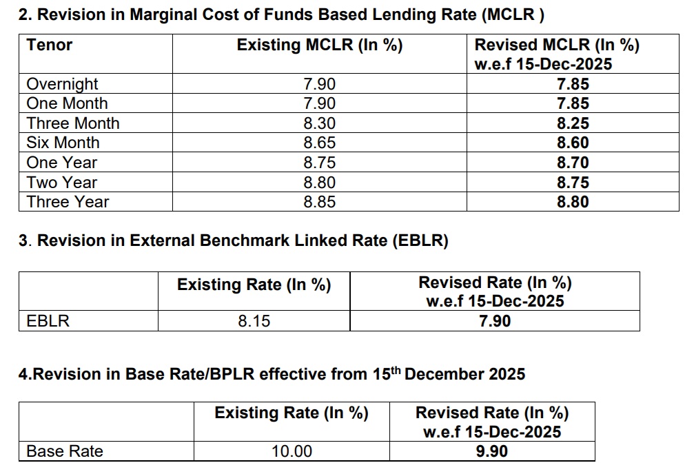 The revised Key Lending Benchmarks and Retail Term Deposit interest rates are applicable w.e.f. 15-Dec-2025