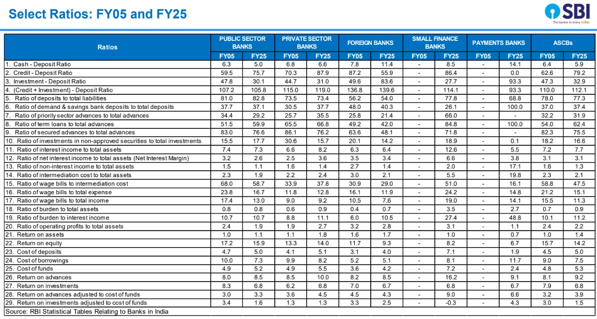 Capital adequacy improved across most PSBs…CRAR levels increased for almost all PSBs between FY21 and FY25…While the CRAR level is high for Private sector banks, a few of them (8 out of 21) seen decline in in FY25 over FY21 ❑ Exposure to sensitive sectors continues to rise…and currently reached Rs 50 lakh crore (almost 27% of total advances)..Of the total exposure to sensitive sectors (FY25), 50% share is attributed to Private sector banks followed by PSBs ate 47% ❑ Banking employment nearly doubled over two decades…Total employees increased from 8.6 lakh to 18.1 lakh, with private banks accounting for 46% and PSBs 42%.... Officer share rose from 36% to 76%…indicating skill intensification and preference for higher-value roles ❑ ASCBs contingent liabilities has soared at an unexceptional pace and grew from Rs 28.3 lakh crore in FY05 to Rs 505.5 lakh crore (an increase of almost 18x)..the share of liability on account of outstanding forward exchange contracts is almost 93% of total contingent liabilities ❑ Threshold regression reveals non-linear leverage–profitability dynamics…. Our threshold regression estimates indicate optimum CD ratio at 76–80% for PSBs and private banks and 65–70% when foreign banks are included…beyond which profitability gains diminish sharply indicating excessive leverage reduces the incremental profitability of banks.
