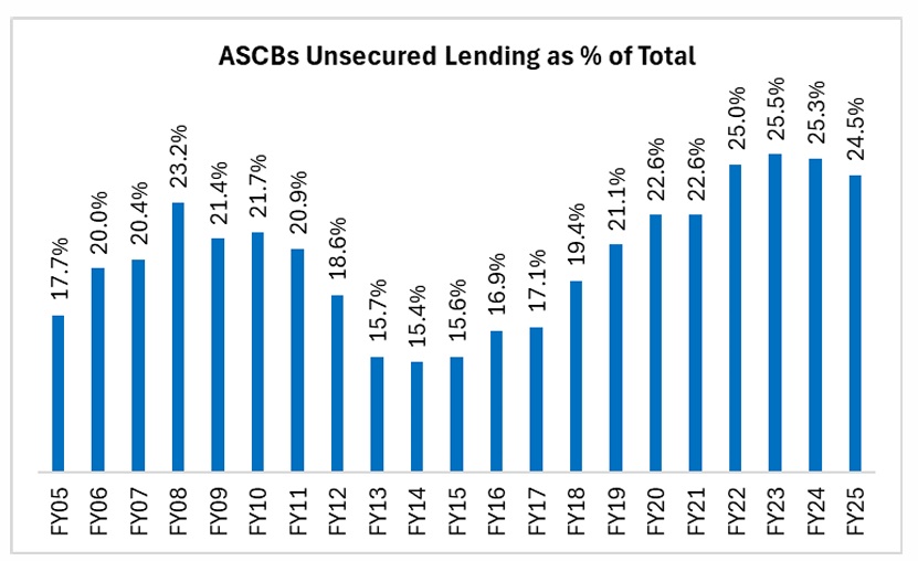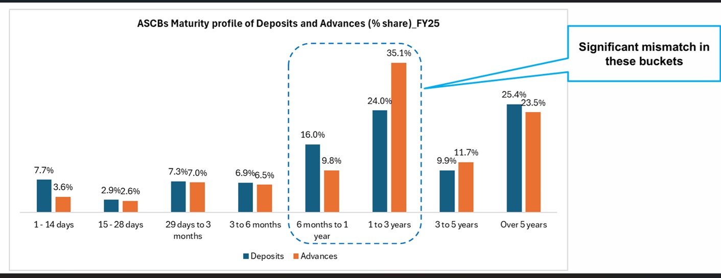 Indian banks have exhibited strong post-pandemic balance sheet revival…Bank asset growth rebounded sharply after FY21, rising from 77% of GDP to 94% by FY25…reflecting renewed credit intermediation and financial deepening ❑ Deposits and advances expanded manifold over two decades…Deposits surged from Rs18.4 lakh crore to Rs241.5 lakh crore and advances from Rs11.5 lakh crore to Rs191.2 lakh crore during FY05–FY25…signaling scale expansion of the banking system… but the speed is much faster in the case of advances…Credit-Deposit (C-D) Ratio increased from 69% in FY21 to 79% in FY25 ❑ Public Sector Banks’ (PSBs) market share shows continued revival…After a secular decline since FY08, PSBs gradually reclaiming advances market share…indicating balance sheet repair and renewed lending appetite ❑ CASA stability masks divergent trends across bank groups…While overall CASA ratios remained around 37%, private banks strengthened CASA shares whereas foreign banks witnessed erosion ❑ There is gap between maturity profile of share of deposits and advances for 6 months to 1 year and 1-3 year time bucket…The 35% share of advances in 1-3 years bucket indicating increasing tendency of pre-payment among borrowers ❑ Sharp rise in unsecured lending raises risk sensitivity…Unsecured advances expanded from Rs2 lakh crore to Rs46.9 lakh crore, with share rising to 24.5% in FY25 from 17.7% in FY05 …underscoring potential credit risk accumulation…
