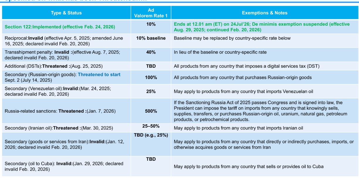 ❑ However, the executive has quickly invoked Section 122 of the 1974 Trade Act to impose new 10% global tariff on all imports to US for 150 days (note: this will be the first time Section 122 authority has ever been used). This temporary measure will start from 24 Feb 2026 and ends in July should the Congress not ratify the imposition